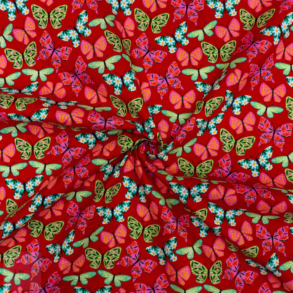 115CM PRINTED POLY COTTON BUTTERFLIES RED